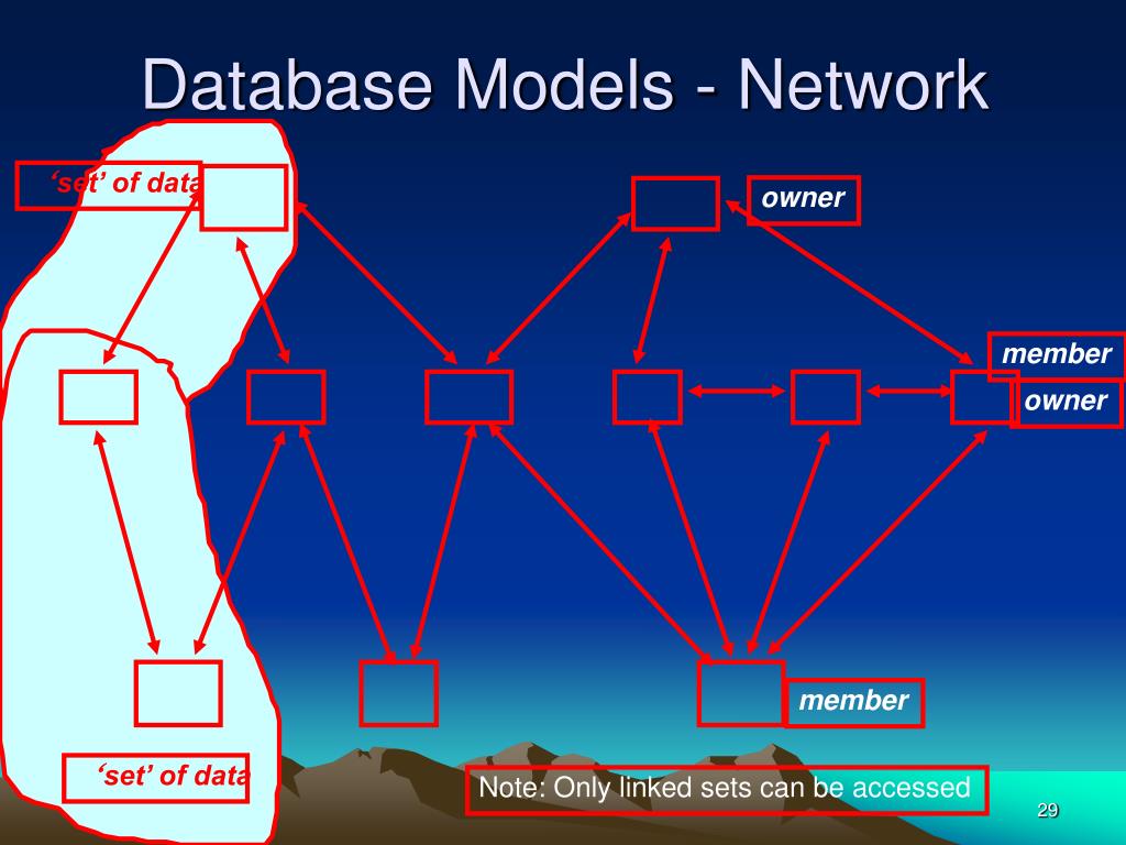 Database Models - Network ‘set’ of data owner member owner member ‘set’ of data Note: Only linked sets can be accessed