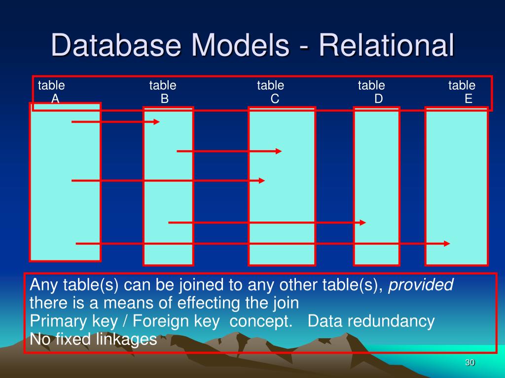 Database Models - Relational table table table table table A B C DE Any table(s) can be joined to any other table(s), provided there is a means of effecting the join Primary key / Foreign key concept. Data redundancy No fixed linkages