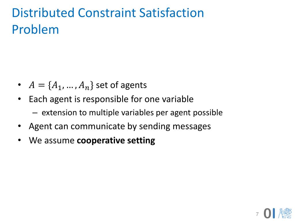 Distributed Constraint Satisfaction Problem • set of agents • Each agent is responsible for one variable • extension to multiple variables per agent possible • Agent can communicate by sending messages • We assume cooperative setting