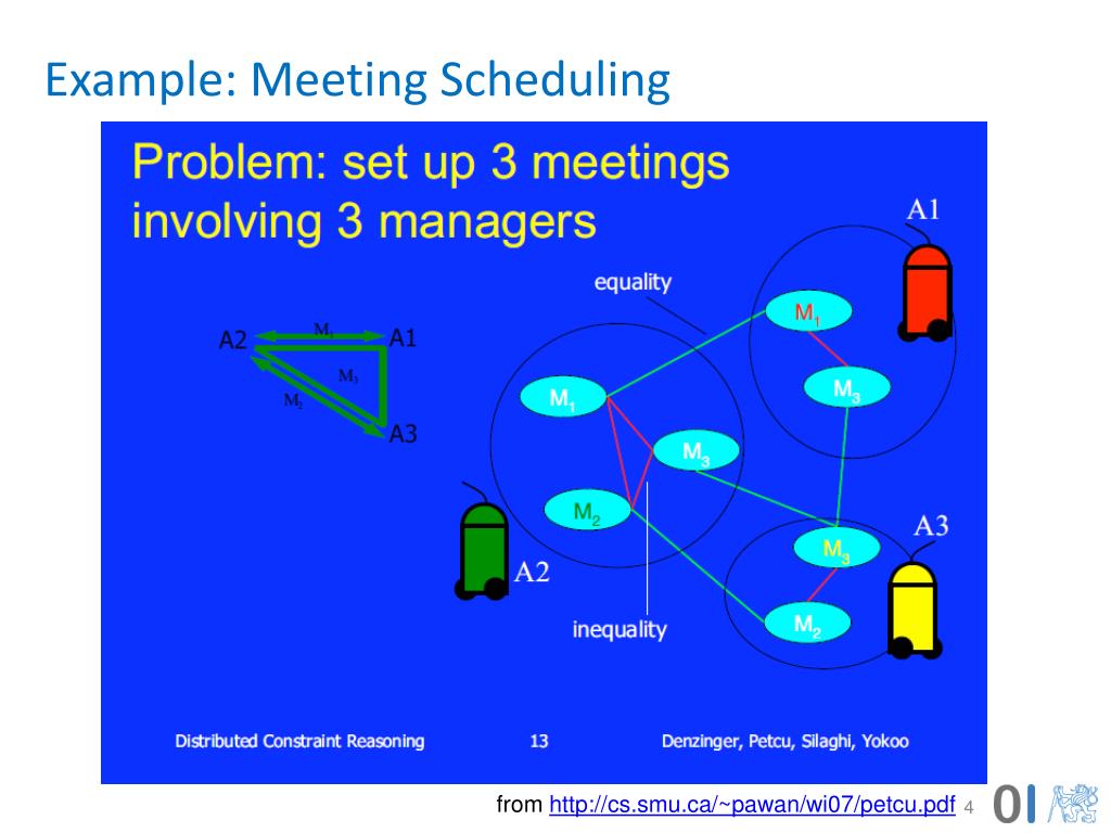 Example: Meeting Scheduling from http://cs.smu.ca/~pawan/wi07/petcu.pdf