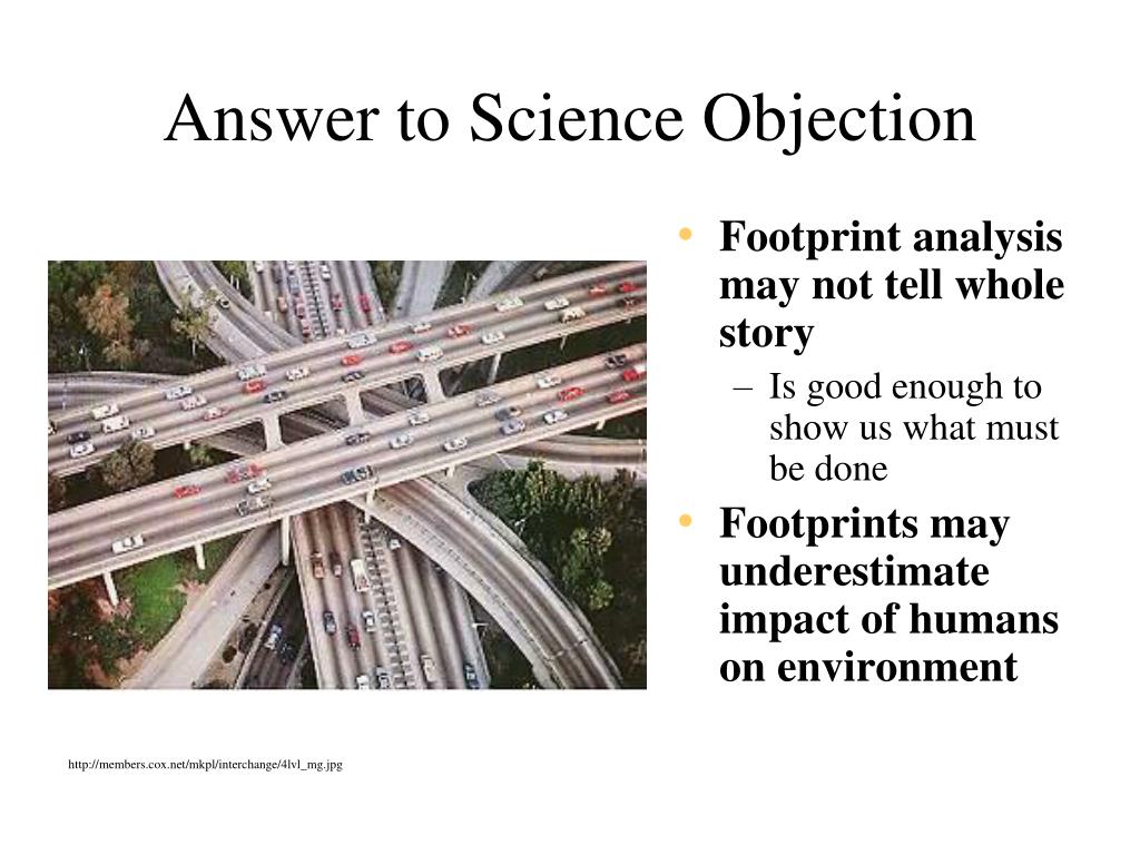 Answer to Science Objection • Footprint analysis may not tell whole story • Is good enough to show us what must be done • Footprints may underestimate impact of humans on environment http://members.cox.net/mkpl/interchange/4lvl_mg.jpg