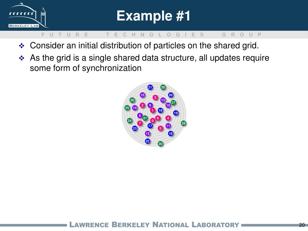 5 6 7 8 9 10 11 12 13 14 15 16 17 18 19 20 21 22 23 24 25 26 27 28 29 30 31 Example #1 0 1 2 3 4 Consider an initial distribution of particles on the shared grid. As the grid is a single shared data structure, all updates require some form of synchronization 20
