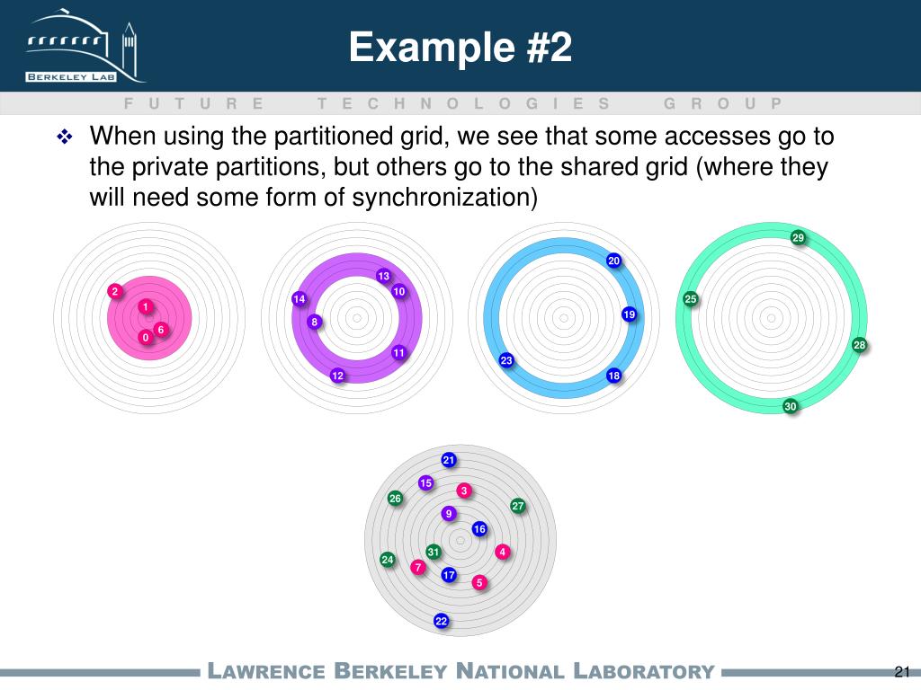 5 6 7 8 9 10 11 12 13 14 15 16 17 18 19 20 21 22 23 24 25 26 27 28 29 30 31 Example #2 0 1 2 3 4 When using the partitioned grid, we see that some accesses go to the private partitions, but others go to the shared grid (where they will need some form of synchronization)