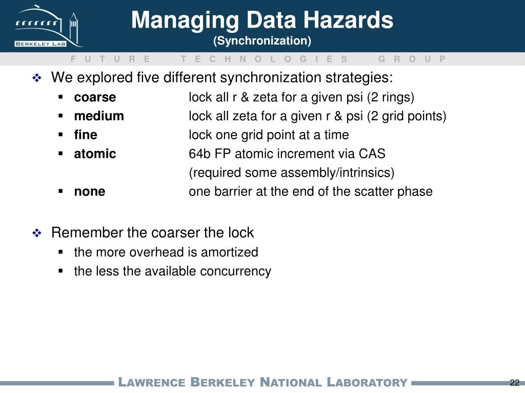 Managing Data Hazards(Synchronization) • We explored five different synchronization strategies: • coarse lock all r & zeta for a given psi (2 rings) • medium lock all zeta for a given r & psi (2 grid points) • fine lock one grid point at a time • atomic 64b FP atomic increment via CAS (required some assembly/intrinsics) • none one barrier at the end of the scatter phase • Remember the coarser the lock • the more overhead is amortized • the less the available concurrency