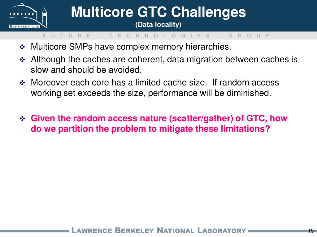 Multicore GTC Challenges(Data locality) MulticoreSMPs have complex memory hierarchies. Although the caches are coherent, data migration between caches is slow and should be avoided. Moreover each core has a limited cache size. If random access working set exceeds the size, performance will be diminished. Given the random access nature (scatter/gather) of GTC, how do we partition the problem to mitigate these limitations?