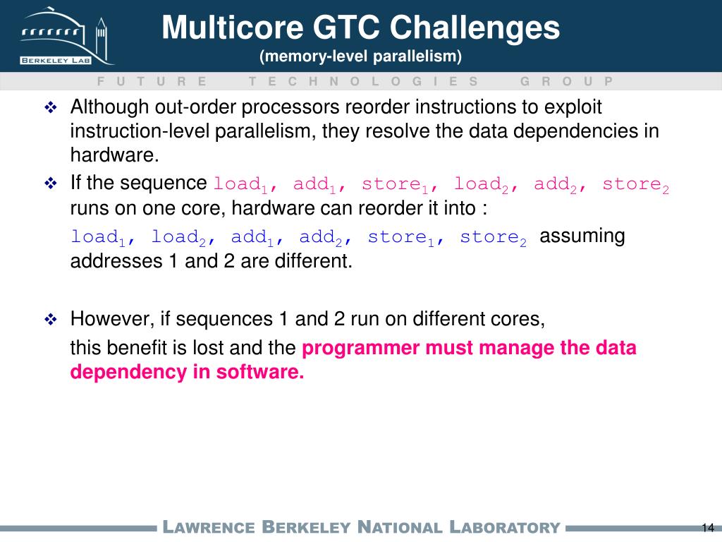 Multicore GTC Challenges(memory-level parallelism) Although out-order processors reorder instructions to exploit instruction-level parallelism, they resolve the data dependencies in hardware. If the sequence load1, add1, store1, load2, add2, store2runs on one core, hardware can reorder it into : load1, load2, add1, add2, store1, store2assuming addresses 1 and 2 are different. However, if sequences 1 and 2 run on different cores, this benefit is lost and the programmer must manage the data dependency in software.