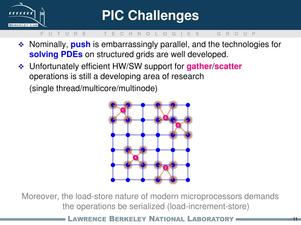 PIC Challenges 1 2 3 4 5 Nominally, push is embarrassingly parallel, and the technologies for solving PDEson structured grids are well developed. Unfortunately efficient HW/SW support for gather/scatter operations is still a developing area of research (single thread/multicore/multinode) Moreover, the load-store nature of modern microprocessors demands the operations be serialized (load-increment-store)