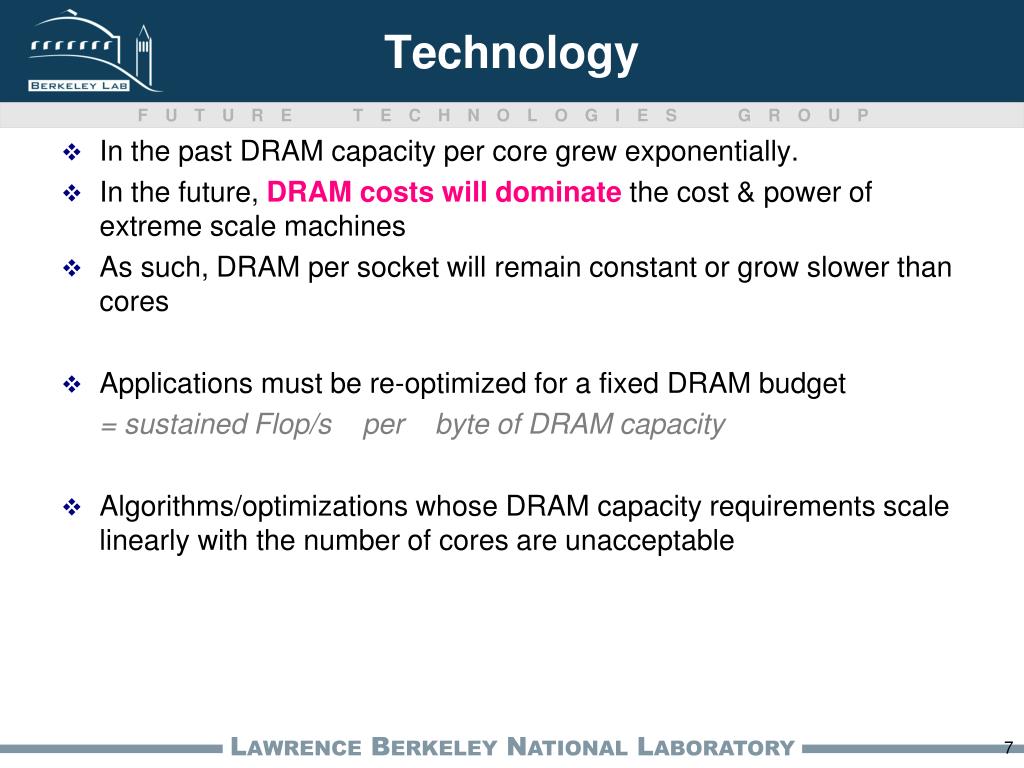 Technology In the past DRAM capacity per core grew exponentially. In the future, DRAM costs will dominate the cost & power of extreme scale machines As such, DRAM per socket will remain constant or grow slower than cores Applications must be re-optimized for a fixed DRAM budget = sustained Flop/s per byte of DRAM capacity Algorithms/optimizations whose DRAM capacity requirements scale linearly with the number of cores are unacceptable
