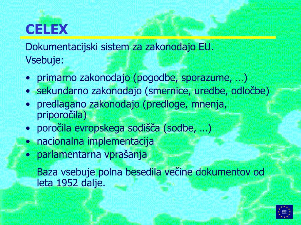 CELEX Dokumentacijski sistem za zakonodajo EU. Vsebuje: • primarno zakonodajo (pogodbe, sporazume, …) • sekundarno zakonodajo (smernice, uredbe, odločbe) • predlagano zakonodajo (predloge, mnenja, priporočila) • poročila evropskega sodišča (sodbe, …) • nacionalna implementacija • parlamentarna vprašanja Baza vsebuje polna besedila večine dokumentov od leta 1952 dalje.