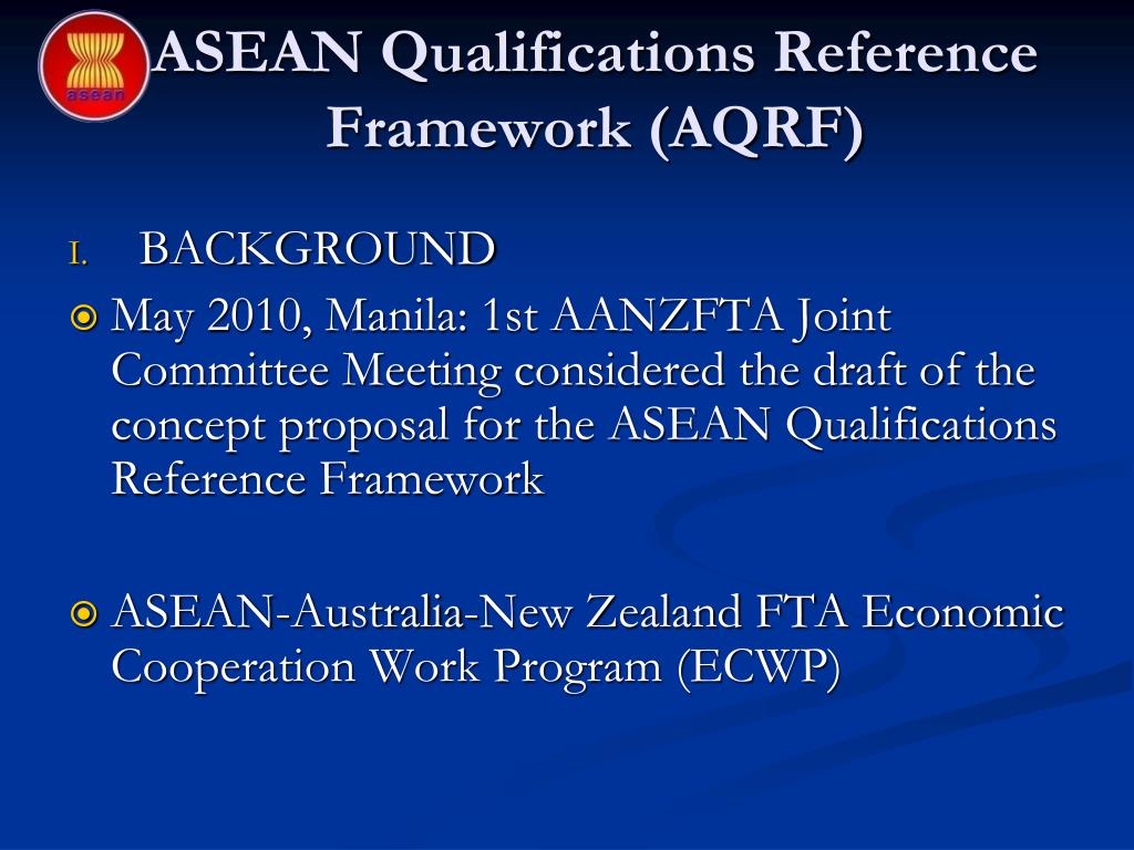 ASEAN Qualifications Reference Framework (AQRF) • BACKGROUND • May 2010, Manila: 1st AANZFTA Joint Committee Meeting considered the draft of the concept proposal for the ASEAN Qualifications Reference Framework • ASEAN-Australia-New Zealand FTA Economic Cooperation Work Program (ECWP)