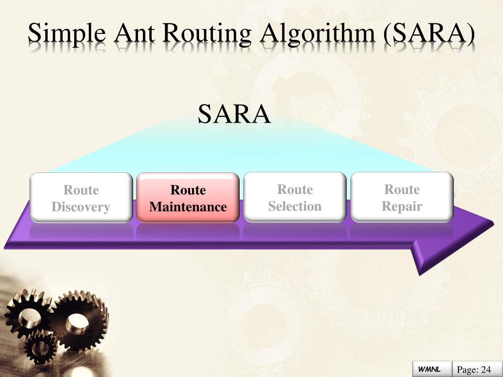 Simple Ant Routing Algorithm (SARA) SARA Route Selection Route Repair Route Discovery Route Maintenance