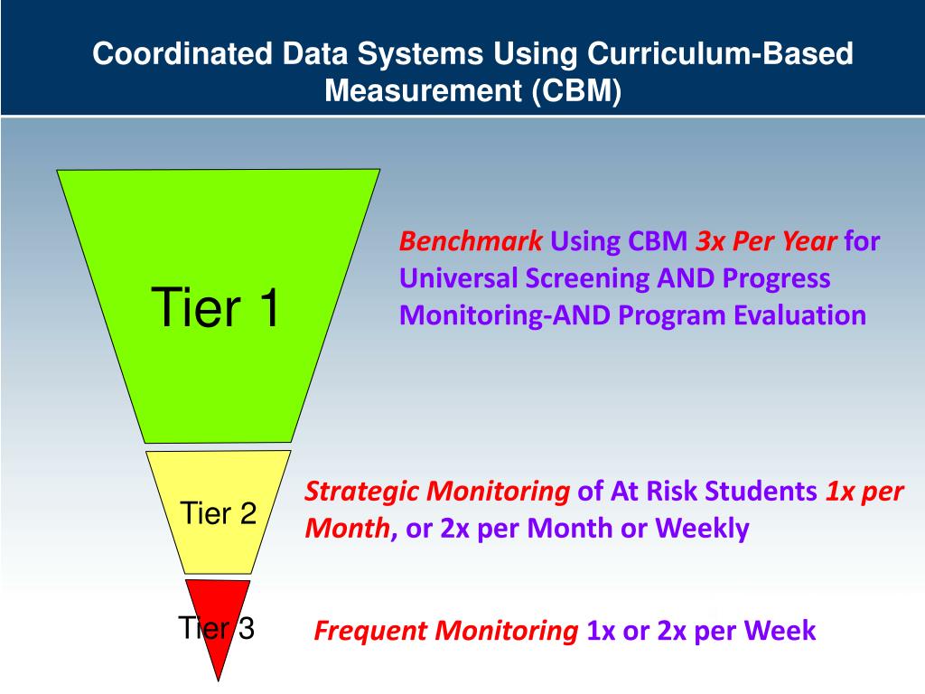 Coordinated Data Systems Using Curriculum-Based Measurement (CBM) Tier 3 Tier 1 Benchmark Using CBM 3x Per Year for Universal Screening AND Progress Monitoring-AND Program Evaluation Tier 2 Strategic Monitoring of At Risk Students 1x per Month, or 2x per Month or Weekly Frequent Monitoring 1x or 2x per Week 26
