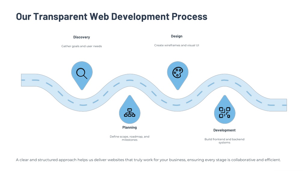 Our Transparent Web Development Process Design Discovery Create wireframes and visual UI Gather goals and user needs Planning Development Define scope, roadmap, and milestones Build frontend and backend systems A clear and structured approach helps us deliver websites that truly work for your business, ensuring every stage is collaborative and efficient.