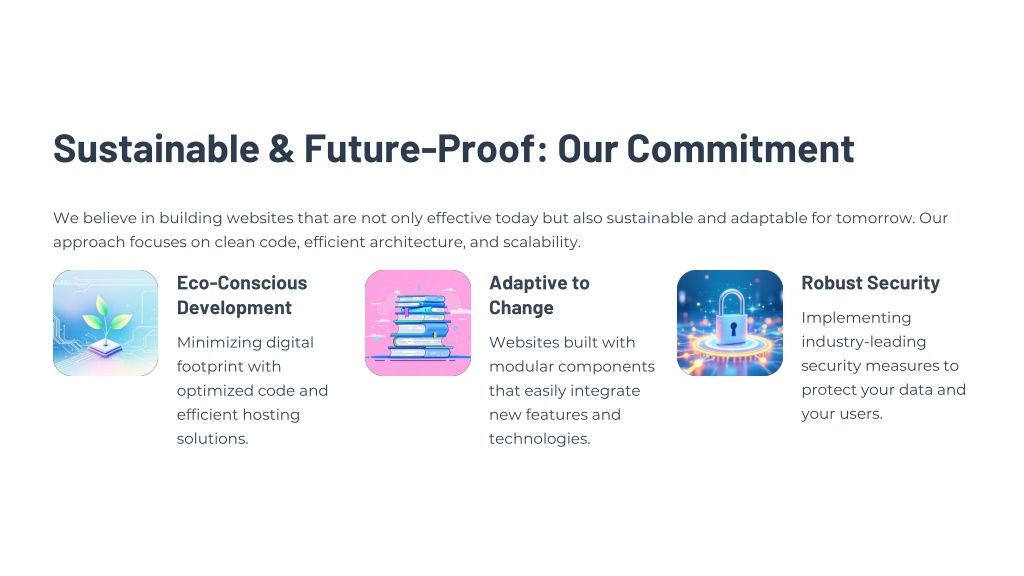 Sustainable & Future-Proof: Our Commitment We believe in building websites that are not only effective today but also sustainable and adaptable for tomorrow. Our approach focuses on clean code, efficient architecture, and scalability. Eco-Conscious Development Adaptive to Change Robust Security Implementing industry-leading security measures to protect your data and your users. Minimizing digital footprint with optimized code and efficient hosting solutions. Websites built with modular components that easily integrate new features and technologies.