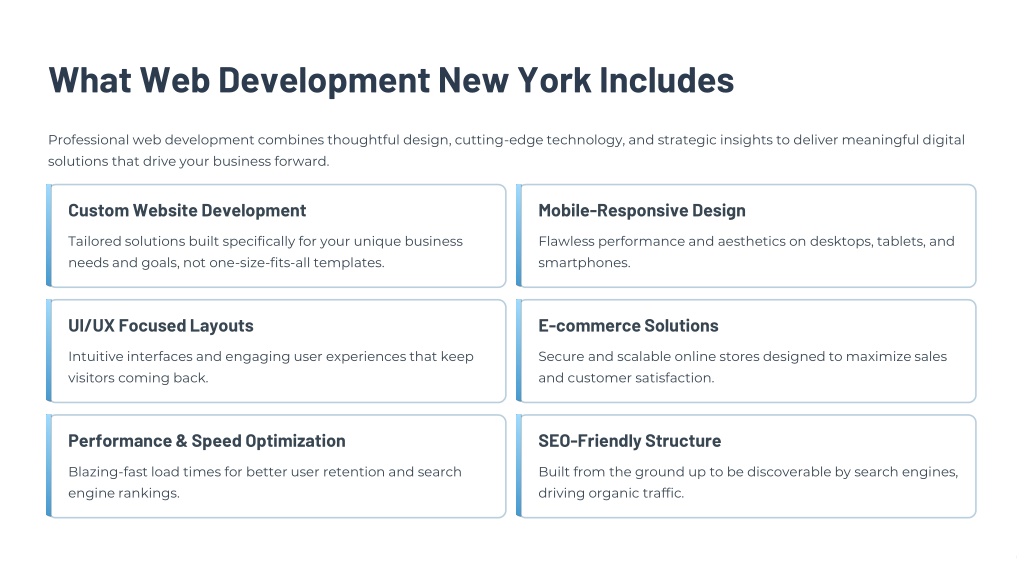 What Web Development New York Includes Professional web development combines thoughtful design, cutting-edge technology, and strategic insights to deliver meaningful digital solutions that drive your business forward. Custom Website Development Mobile-Responsive Design Tailored solutions built specifically for your unique business needs and goals, not one-size-fits-all templates. Flawless performance and aesthetics on desktops, tablets, and smartphones. UI/UX Focused Layouts E-commerce Solutions Intuitive interfaces and engaging user experiences that keep visitors coming back. Secure and scalable online stores designed to maximize sales and customer satisfaction. Performance & Speed Optimization SEO-Friendly Structure Blazing-fast load times for better user retention and search engine rankings. Built from the ground up to be discoverable by search engines, driving organic traffic.