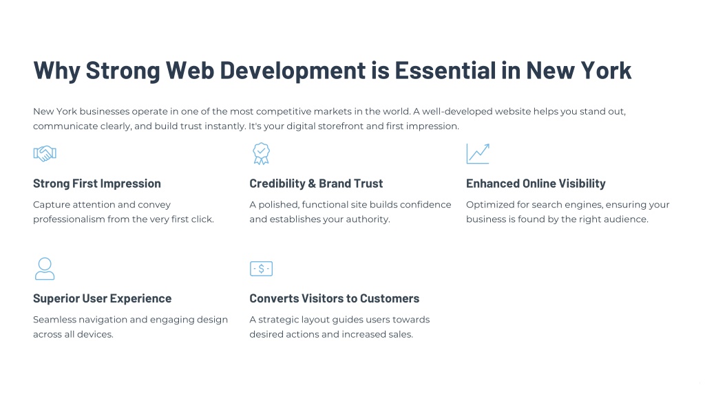 Why Strong Web Development is Essential in New York New York businesses operate in one of the most competitive markets in the world. A well-developed website helps you stand out, communicate clearly, and build trust instantly. It's your digital storefront and first impression. Strong First Impression Credibility & Brand Trust Enhanced Online Visibility Capture attention and convey professionalism from the very first click. A polished, functional site builds confidence and establishes your authority. Optimized for search engines, ensuring your business is found by the right audience. Superior User Experience Converts Visitors to Customers Seamless navigation and engaging design across all devices. A strategic layout guides users towards desired actions and increased sales.