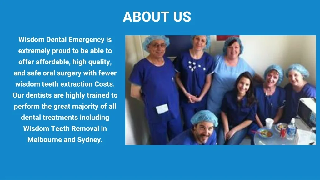 ABOUT US Wisdom Dental Emergency is extremely proud to be able to offer affordable, high quality, and safe oral surgery with fewer wisdom teeth extraction Costs. Our dentists are highly trained to perform the great majority of all dental treatments including Wisdom Teeth Removal in Melbourne and Sydney.