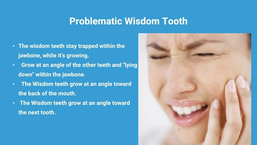 Problematic Wisdom Tooth • The wisdom teeth stay trapped within the jawbone, while it's growing. • Grow at an angle of the other teeth and "lying down" within the jawbone. • The Wisdom teeth grow at an angle toward the back of the mouth. • The Wisdom teeth grow at an angle toward the next tooth.