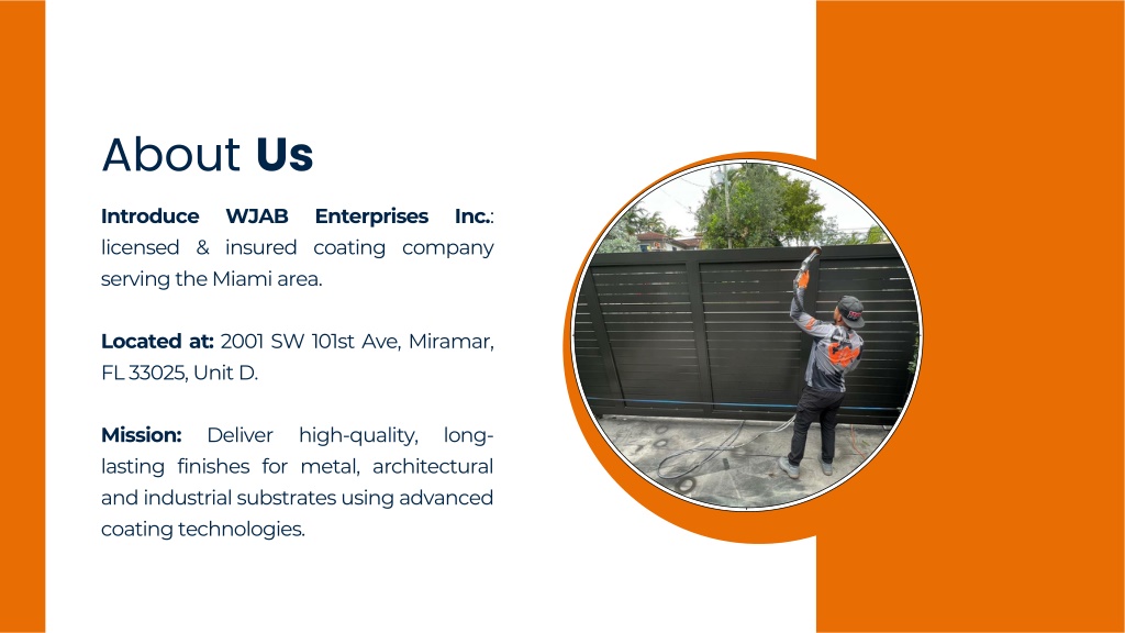 2. About Us Introduce WJAB Enterprises Inc.: licensed & insured coating company serving the Miami area. Located at: 2001 SW 101st Ave, Miramar, FL 33025, Unit D. Mission: Deliver high-quality, long-lasting finishes for metal, architectural and industrial substrates using advanced coating technologies.