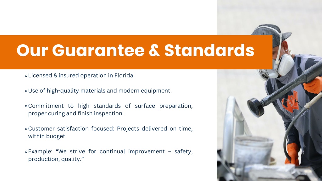 8. Our Guarantee & Standards • Licensed & insured operation in Florida. • Use of high-quality materials and modern equipment. • Commitment to high standards of surface preparation, proper curing and finish inspection. • Customer satisfaction focused: Projects delivered on time, within budget. • Example: “We strive for continual improvement – safety, production, quality.”