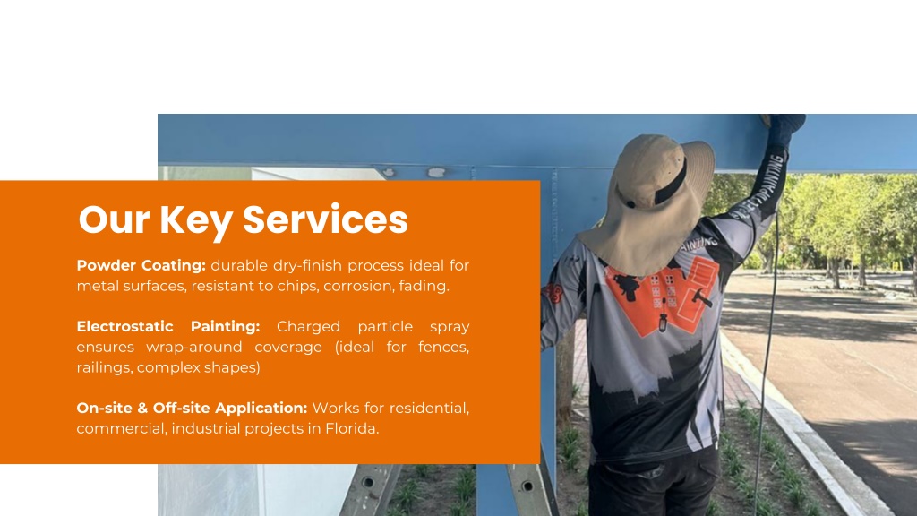 3. Our Key Services Powder Coating: durable dry-finish process ideal for metal surfaces, resistant to chips, corrosion, fading. Electrostatic Painting: Charged particle spray ensures wrap-around coverage (ideal for fences, railings, complex shapes) On-site & Off-site Application: Works for residential, commercial, industrial projects in Florida.