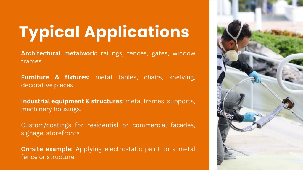 5. Typical Applications Architectural metalwork: railings, fences, gates, window frames. Furniture & fixtures: metal tables, chairs, shelving, decorative pieces. Industrial equipment & structures: metal frames, supports, machinery housings. Custom/coatings for residential or commercial facades, signage, storefronts. On-site example: Applying electrostatic paint to a metal fence or structure.