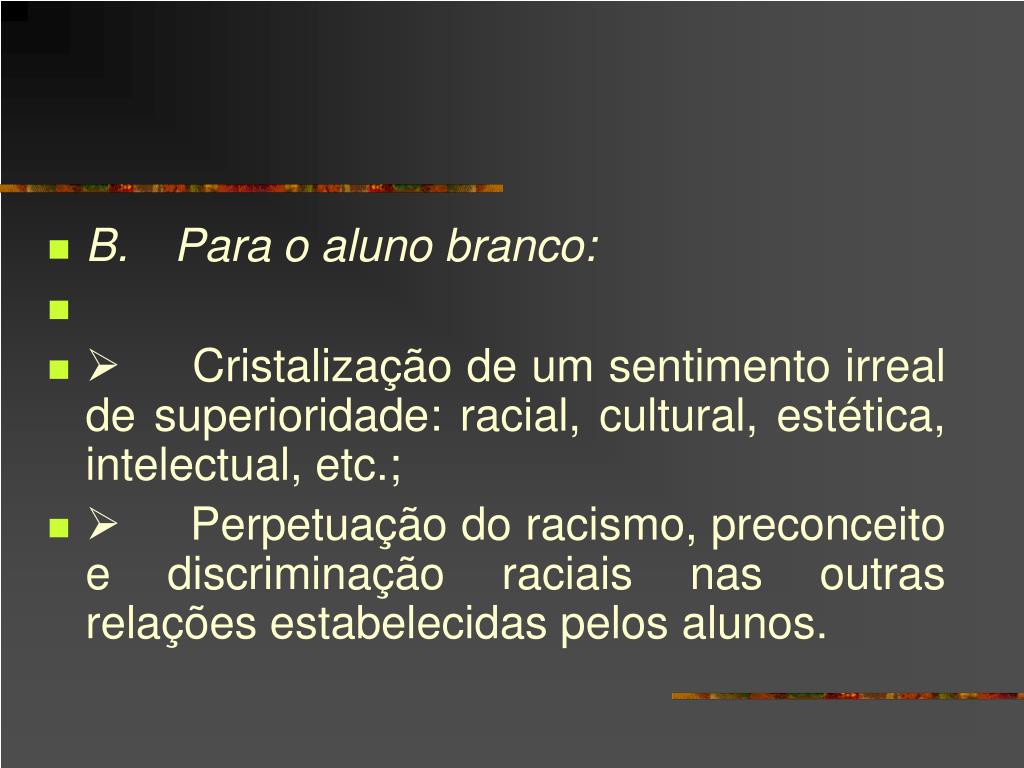 B.Para o aluno branco: • ØCristalização de um sentimento irreal de superioridade: racial, cultural, estética, intelectual, etc.; • ØPerpetuação do racismo, preconceito e discriminação raciais nas outras relações estabelecidas pelos alunos.