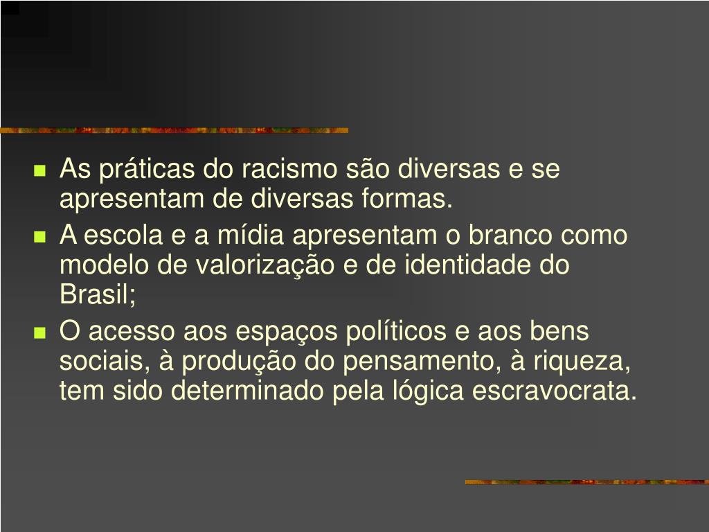 As práticas do racismo são diversas e se apresentam de diversas formas. • A escola e a mídia apresentam o branco como modelo de valorização e de identidade do Brasil; • O acesso aos espaços políticos e aos bens sociais, à produção do pensamento, à riqueza, tem sido determinado pela lógica escravocrata.