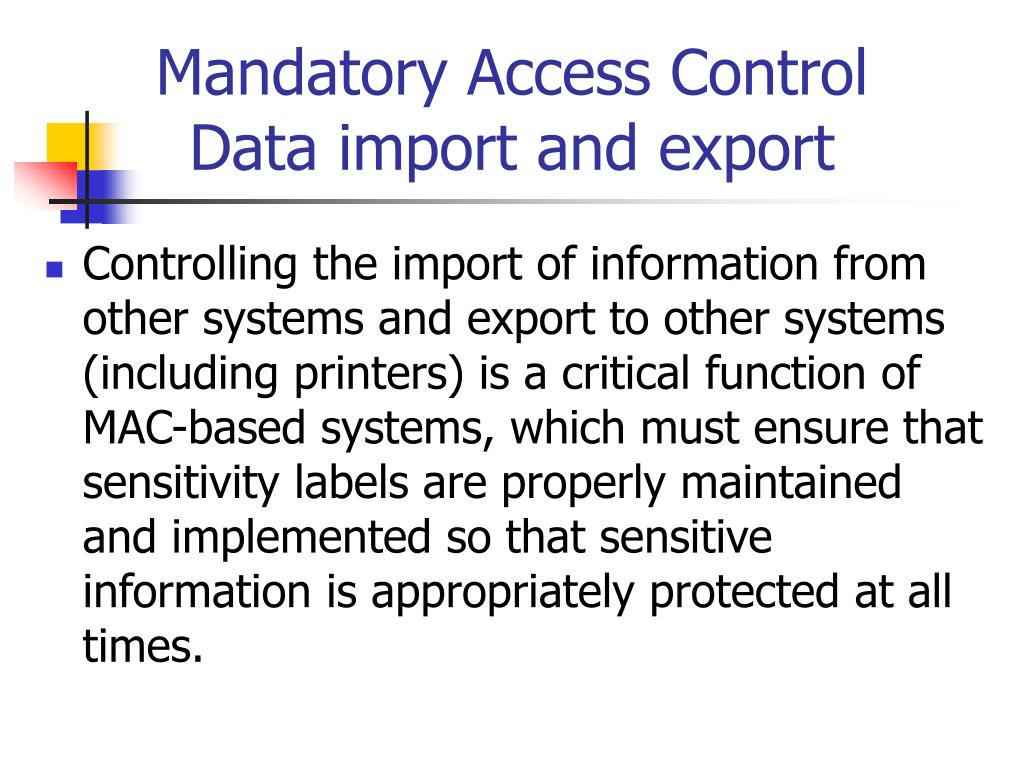 Mandatory Access Control Data import and export • Controlling the import of information from other systems and export to other systems (including printers) is a critical function of MAC-based systems, which must ensure that sensitivity labels are properly maintained and implemented so that sensitive information is appropriately protected at all times.