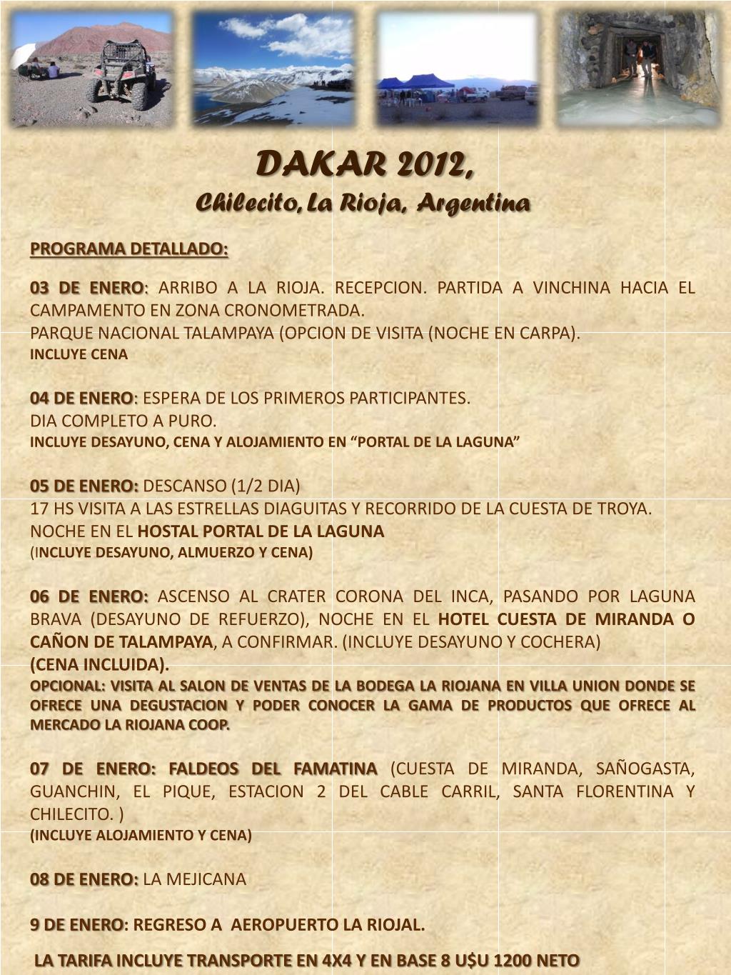 DAKAR 2012, Chilecito, La Rioja, Argentina PROGRAMA DETALLADO: 03 DE ENERO: ARRIBO A LA RIOJA. RECEPCION. PARTIDA A VINCHINA HACIA EL CAMPAMENTO EN ZONA CRONOMETRADA. PARQUE NACIONAL TALAMPAYA (OPCION DE VISITA (NOCHE EN CARPA). INCLUYE CENA 04 DE ENERO: ESPERA DE LOS PRIMEROS PARTICIPANTES. DIA COMPLETO A PURO. INCLUYE DESAYUNO, CENA Y ALOJAMIENTO EN “PORTAL DE LA LAGUNA” 05 DE ENERO:DESCANSO (1/2 DIA) 17 HS VISITA A LAS ESTRELLAS DIAGUITAS Y RECORRIDO DE LA CUESTA DE TROYA. NOCHE EN EL HOSTAL PORTAL DE LA LAGUNA (INCLUYE DESAYUNO, ALMUERZO Y CENA) 06 DE ENERO: ASCENSO AL CRATER CORONA DEL INCA, PASANDO POR LAGUNA BRAVA (DESAYUNO DE REFUERZO), NOCHE EN EL HOTEL CUESTA DE MIRANDA O CAÑON DE TALAMPAYA, A CONFIRMAR. (INCLUYE DESAYUNO Y COCHERA) (CENA INCLUIDA). OPCIONAL: VISITA AL SALON DE VENTAS DE LA BODEGA LA RIOJANA EN VILLA UNION DONDE SE OFRECE UNA DEGUSTACION Y PODER CONOCER LA GAMA DE PRODUCTOS QUE OFRECE AL MERCADO LA RIOJANA COOP. 07 DE ENERO: FALDEOS DEL FAMATINA (CUESTA DE MIRANDA, SAÑOGASTA, GUANCHIN, EL PIQUE, ESTACION 2 DEL CABLE CARRIL, SANTA FLORENTINA Y CHILECITO.) (INCLUYE ALOJAMIENTO Y CENA) 08 DE ENERO: LA MEJICANA 9 DE ENERO: REGRESO A AEROPUERTO LA RIOJAL. LA TARIFA INCLUYE TRANSPORTE EN 4X4 Y EN BASE 8 U$U 1200 NETO
