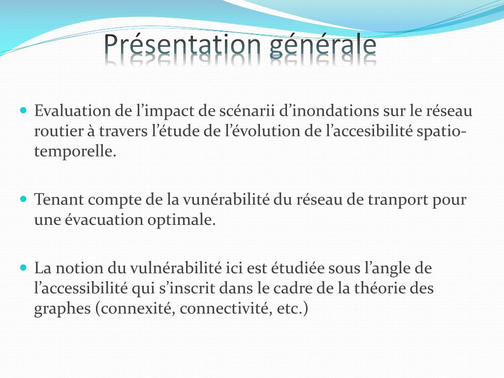 Présentationgénérale • Evaluation de l’impact de scénariid’inondationssur le réseauroutier à traversl’étude de l’évolution de l’accesibilitéspatio-temporelle. • Tenant compte de la vunérabilité du réseau de tranport pour uneévacuationoptimale. • La notion du vulnérabilitéiciestétudiéesousl’angle de l’accessibilité qui s’inscritdans le cadre de la théorie des graphes (connexité, connectivité, etc.)