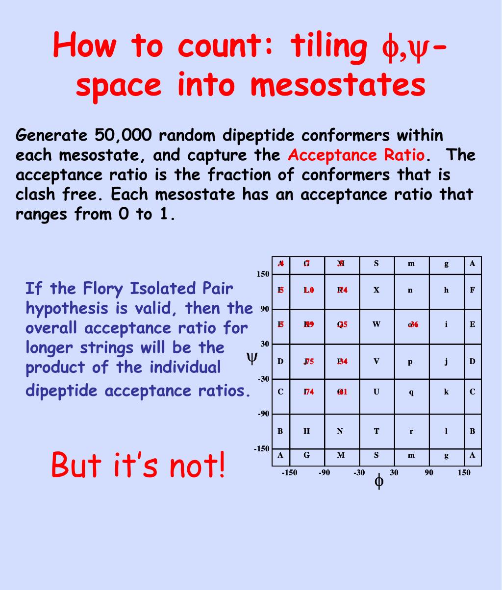 If the Flory Isolated Pair hypothesis is valid, then the overall acceptance ratio for longer strings will be the product of the individual dipeptide acceptance ratios. How to count: tiling f,y-space into mesostates Generate 50,000 random dipeptide conformers within each mesostate, and capture the Acceptance Ratio. The acceptance ratio is the fraction of conformers that is clash free. Each mesostate has an acceptance ratio that ranges from 0 to 1. But it’s not!