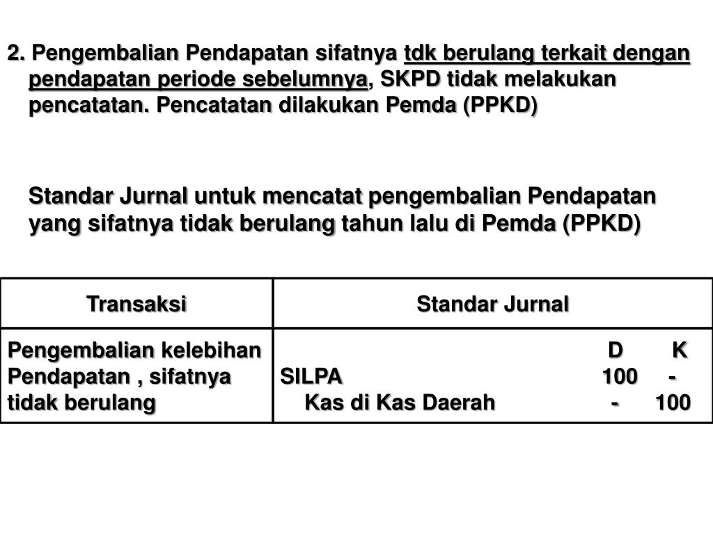 2. PengembalianPendapatansifatnyatdkberulangterkaitdenganpendapatanperiodesebelumnya, SKPD tidakmelakukanpencatatan. PencatatandilakukanPemda (PPKD) StandarJurnaluntukmencatatpengembalianPendapatan yang sifatnyatidakberulangtahunlaludiPemda (PPKD) Transaksi StandarJurnal PengembaliankelebihanPendapatan , sifatnyatidakberulang D K SILPA 100 - KasdiKas Daerah - 100