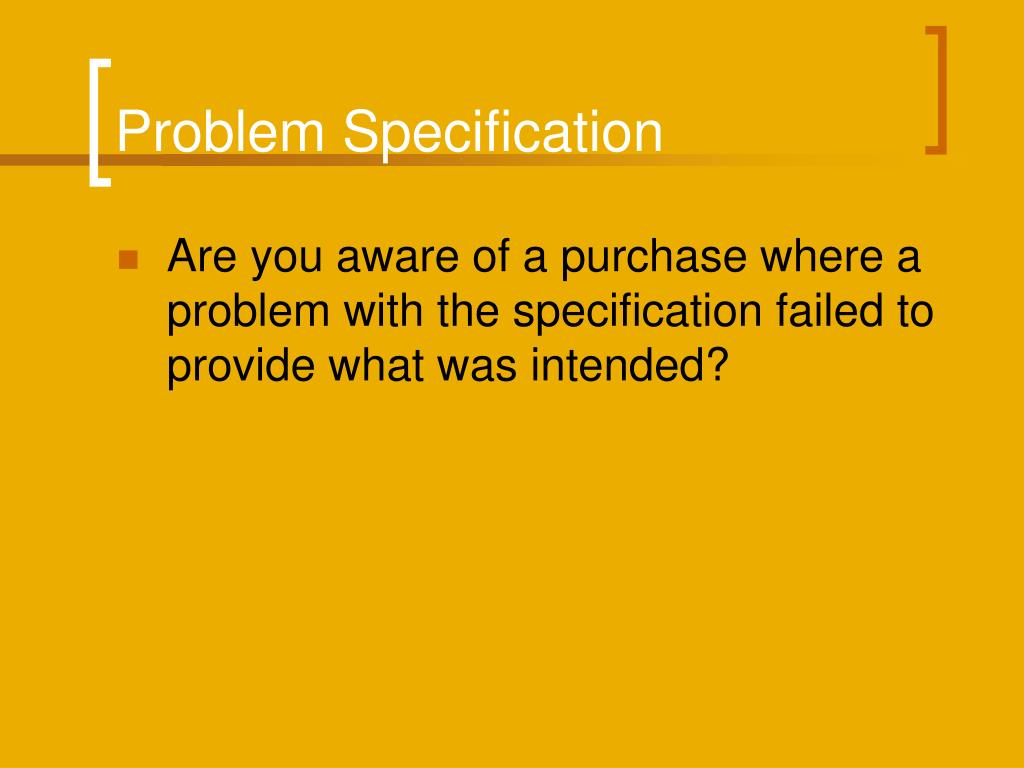 Problem Specification • Are you aware of a purchase where a problem with the specification failed to provide what was intended?