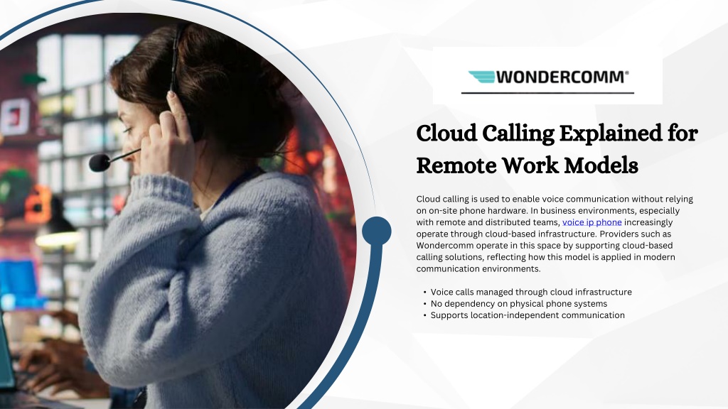 Cloud Calling Explained for Remote Work Models • Cloud calling is used to enable voice communication without relying on on-site phone hardware. In business environments, especially with remote and distributed teams, voice ip phone increasingly operate through cloud-based infrastructure. Providers such as Wondercomm operate in this space by supporting cloud-based calling solutions, reflecting how this model is applied in modern communication environments. • Voice calls managed through cloud infrastructure • No dependency on physical phone systems • Supports location-independent communication