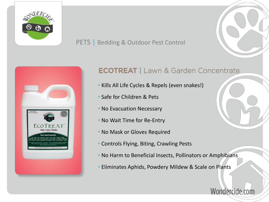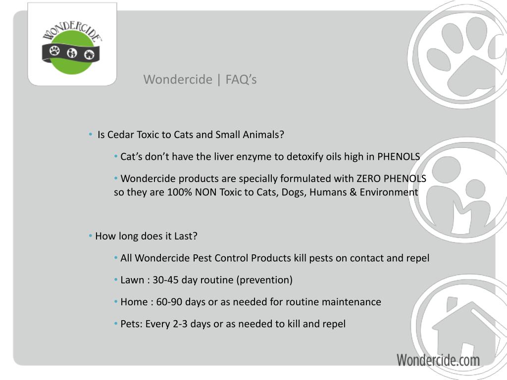 Wondercide | FAQ’s • Is Cedar Toxic to Cats and Small Animals? • Cat’s don’t have the liver enzyme to detoxify oils high in PHENOLS • Wondercide products are specially formulated with ZERO PHENOLS so they are 100% NON Toxic to Cats, Dogs, Humans & Environment • How long does it Last? • All Wondercide Pest Control Products kill pests on contact and repel • Lawn : 30-45 day routine (prevention) • Home : 60-90 days or as needed for routine maintenance • Pets: Every 2-3 days or as needed to kill and repel