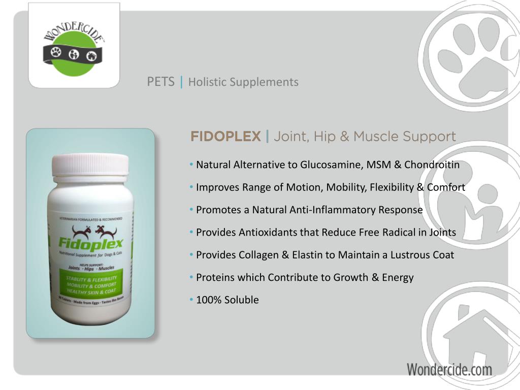 PETS |Holistic Supplements • Natural Alternative to Glucosamine, MSM & Chondroitin • Improves Range of Motion, Mobility, Flexibility & Comfort • Promotes a Natural Anti-Inflammatory Response • Provides Antioxidants that Reduce Free Radical in Joints • Provides Collagen & Elastin to Maintain a Lustrous Coat • Proteins which Contribute to Growth & Energy • 100% Soluble