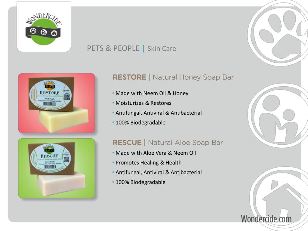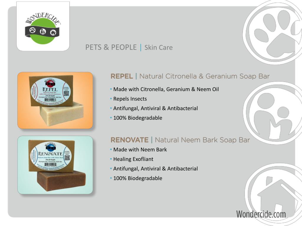 PETS & PEOPLE |Skin Care • Made with Citronella, Geranium & Neem Oil • Repels Insects • Antifungal, Antiviral & Antibacterial • 100% Biodegradable • Made with Neem Bark • Healing Exofliant • Antifungal, Antiviral & Antibacterial • 100% Biodegradable