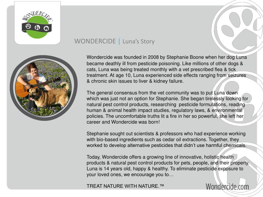 WONDERCIDE |Luna’s Story Wondercide was founded in 2008 by Stephanie Boone when her dog Lunabecame deathly ill from pesticide poisoning. Like millions of other dogs & cats, Luna was being treated monthly with a vet prescribed flea & tick treatment. At age 10, Luna experienced side effects ranging from seizures & chronic skin issues to liver & kidney failure. The general consensus from the vet community was to put Luna down which was just not an option for Stephanie. She began tirelessly looking for natural pest control products, researching pesticide formulations, reading human & animal health impact studies, regulatory laws, & environmental policies. The uncomfortable truths lit a fire in her so powerful, she left her career and Wondercide was born! Stephanie sought out scientists & professors who had experience working with bio-based ingredients such as cedar oil extractions. Together, they worked to develop alternative pesticides that didn’t use harmful chemicals. Today, Wondercide offers a growing line of innovative, holistic health products & natural pest control products for pets, people, and their property. Luna is 14 years old, happy & healthy. To eliminate pesticide exposure to your loved ones, we encourage you to… TREAT NATURE WITH NATURE.™