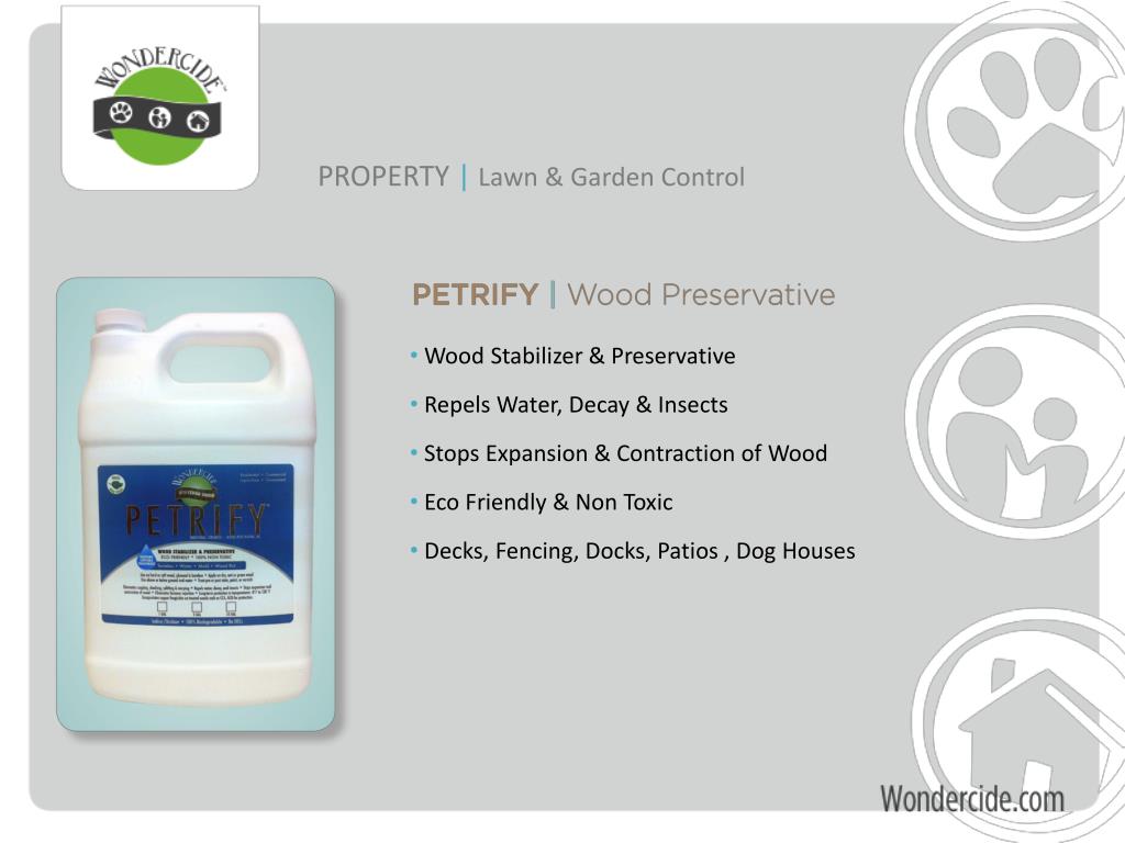 PROPERTY |Lawn & Garden Control • Wood Stabilizer & Preservative • Repels Water, Decay & Insects • Stops Expansion & Contraction of Wood • Eco Friendly & Non Toxic • Decks, Fencing, Docks, Patios , Dog Houses