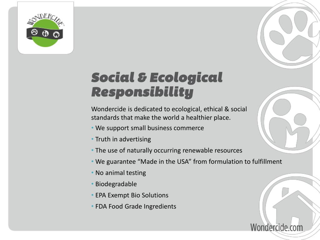 Wondercide is dedicated to ecological, ethical & social standards that make the world a healthier place. • We support small business commerce • Truth in advertising • The use of naturally occurring renewable resources • We guarantee “Made in the USA” from formulation to fulfillment • No animal testing • Biodegradable • EPA Exempt Bio Solutions • FDA Food Grade Ingredients