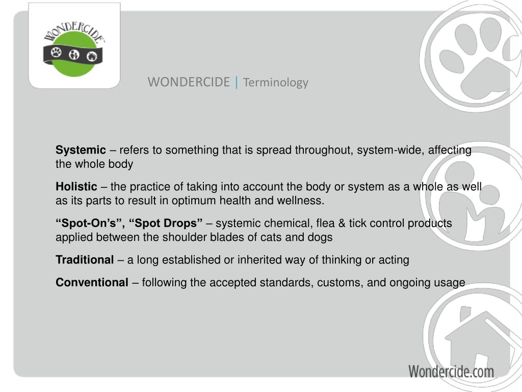 WONDERCIDE |Terminology Systemic – refers to something that is spread throughout, system-wide, affecting the whole body Holistic – the practice of taking into account the body or system as a whole as well as its parts to result in optimum health and wellness. “Spot-On’s”, “Spot Drops” – systemic chemical, flea & tick control products applied between the shoulder blades of cats and dogs Traditional – a long established or inherited way of thinking or acting Conventional – following the accepted standards, customs, and ongoing usage