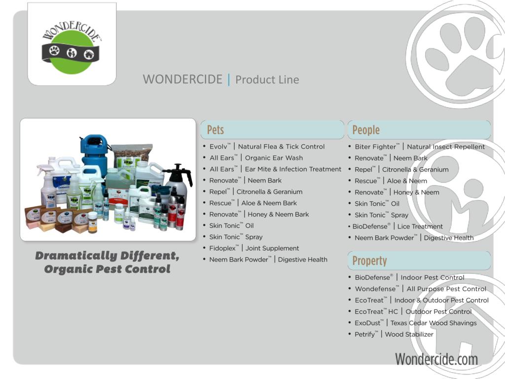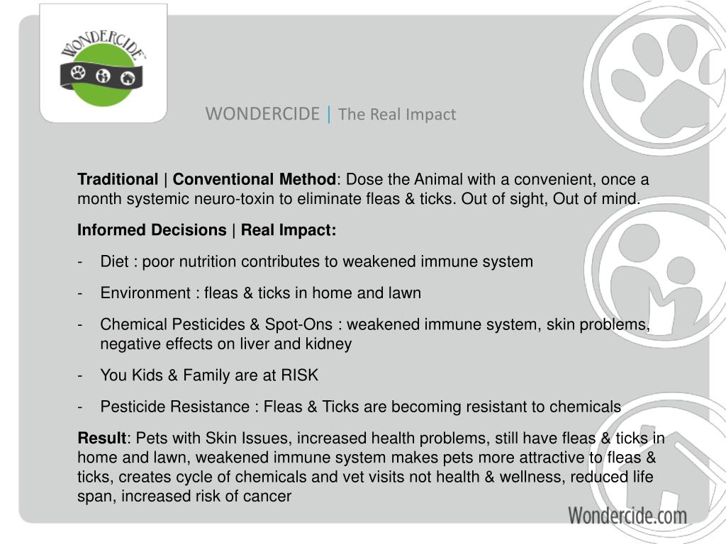 WONDERCIDE |The Real Impact • Traditional | Conventional Method: Dose the Animal with a convenient, once a month systemic neuro-toxin to eliminate fleas & ticks. Out of sight, Out of mind. • Informed Decisions | Real Impact: • Diet : poor nutrition contributes to weakened immune system • Environment : fleas & ticks in home and lawn • Chemical Pesticides & Spot-Ons : weakened immune system, skin problems, negative effects on liver and kidney • You Kids & Family are at RISK • Pesticide Resistance : Fleas & Ticks are becoming resistant to chemicals • Result: Pets with Skin Issues, increased health problems, still have fleas & ticks in home and lawn, weakened immune system makes pets more attractive to fleas & ticks, creates cycle of chemicals and vet visits not health & wellness, reduced life span, increased risk of cancer
