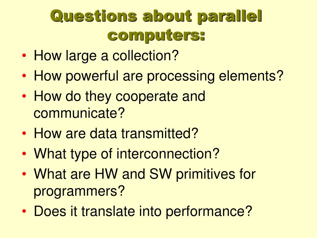 Questions about parallel computers: • How large a collection? • How powerful are processing elements? • How do they cooperate and communicate? • How are data transmitted? • What type of interconnection? • What are HW and SW primitives for programmers? • Does it translate into performance?