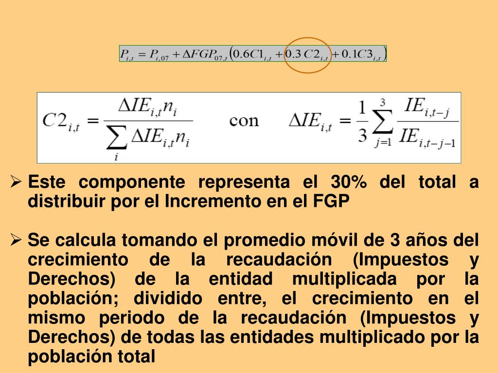 Este componente representa el 30% del total a distribuir por el Incremento en el FGP • Se calcula tomando el promedio móvil de 3 años del crecimiento de la recaudación (Impuestos y Derechos) de la entidad multiplicada por la población; dividido entre, el crecimiento en el mismo periodo de la recaudación (Impuestos y Derechos) de todas las entidades multiplicado por la población total