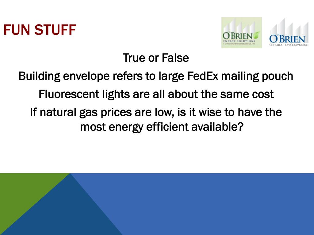 Fun Stuff True or False Building envelope refers to large FedEx mailing pouch Fluorescent lights are all about the same cost If natural gas prices are low, is it wise to have the most energy efficient available?