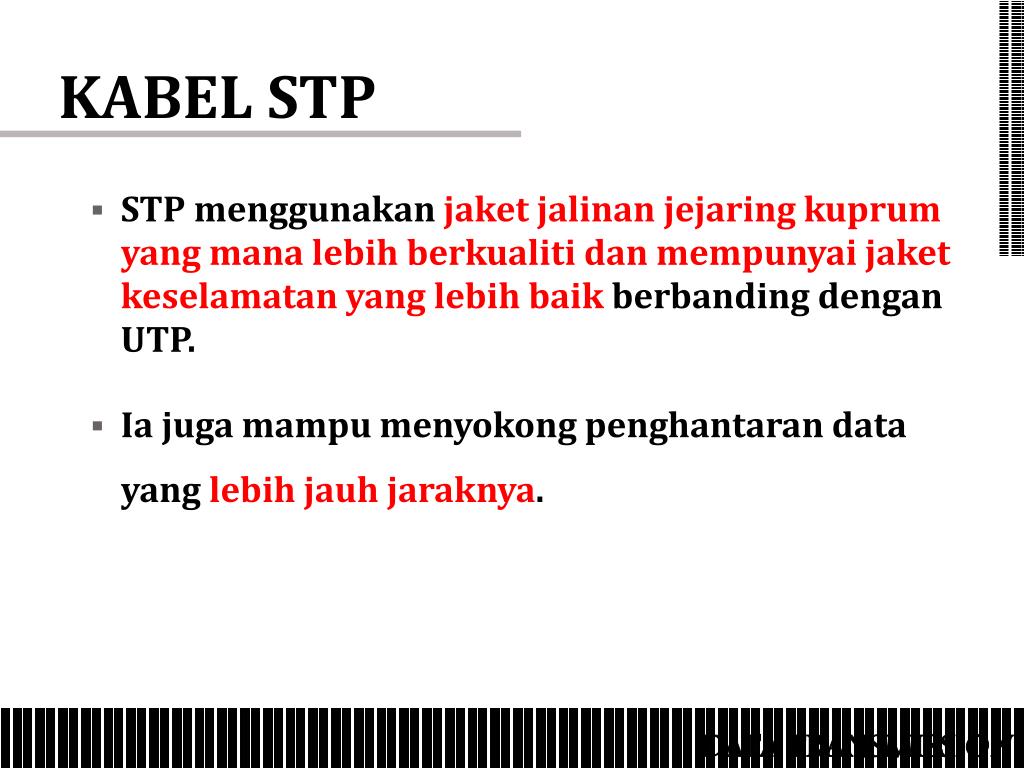 KABEL STP • STP menggunakan jaket jalinan jejaring kuprum yang mana lebih berkualiti dan mempunyai jaket keselamatan yang lebih baik berbanding dengan UTP. • Ia juga mampu menyokong penghantaran data yang lebih jauh jaraknya. DATA TRANSMISSION