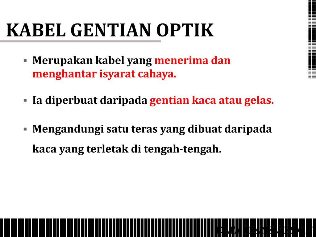 KABEL GENTIAN OPTIK • Merupakan kabel yang menerima dan menghantar isyarat cahaya. • Ia diperbuat daripada gentian kaca atau gelas. • Mengandungi satu teras yang dibuat daripada kaca yang terletak di tengah-tengah. DATA TRANSMISSION