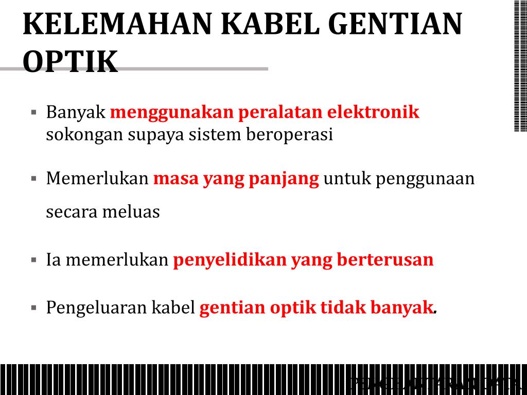 KELEMAHAN KABEL GENTIAN OPTIK • Banyak menggunakan peralatan elektroniksokongan supaya sistem beroperasi • Memerlukan masa yang panjang untuk penggunaan secara meluas • Ia memerlukan penyelidikan yang berterusan • Pengeluaran kabel gentian optik tidak banyak. PENGHANTARAN DATA