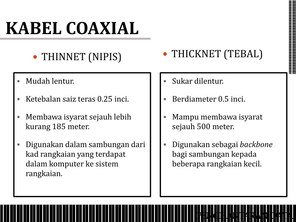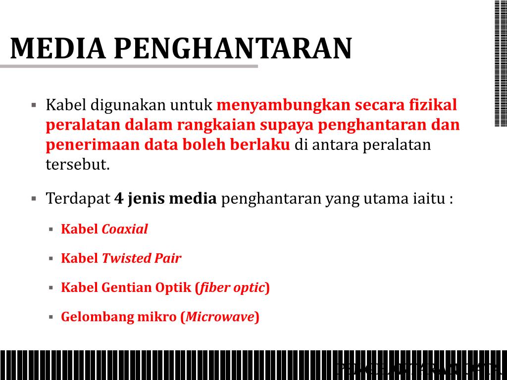 MEDIA PENGHANTARAN. MEDIA PENGHANTARAN. Kabel digunakan untuk menyambungkan secara fizikal peralatan dalam rangkaian supaya penghantaran dan penerimaan data boleh berlaku di antara peralatan tersebut . Terdapat 4 jenis media penghantaran yang utama iaitu : Kabel Coaxial